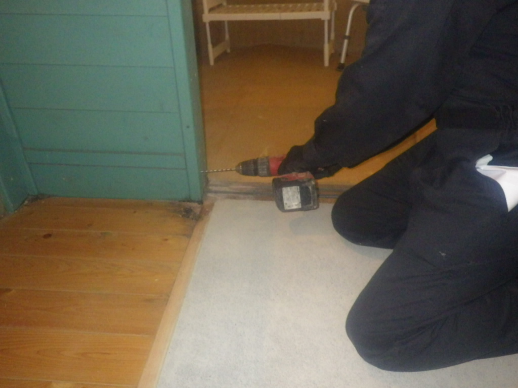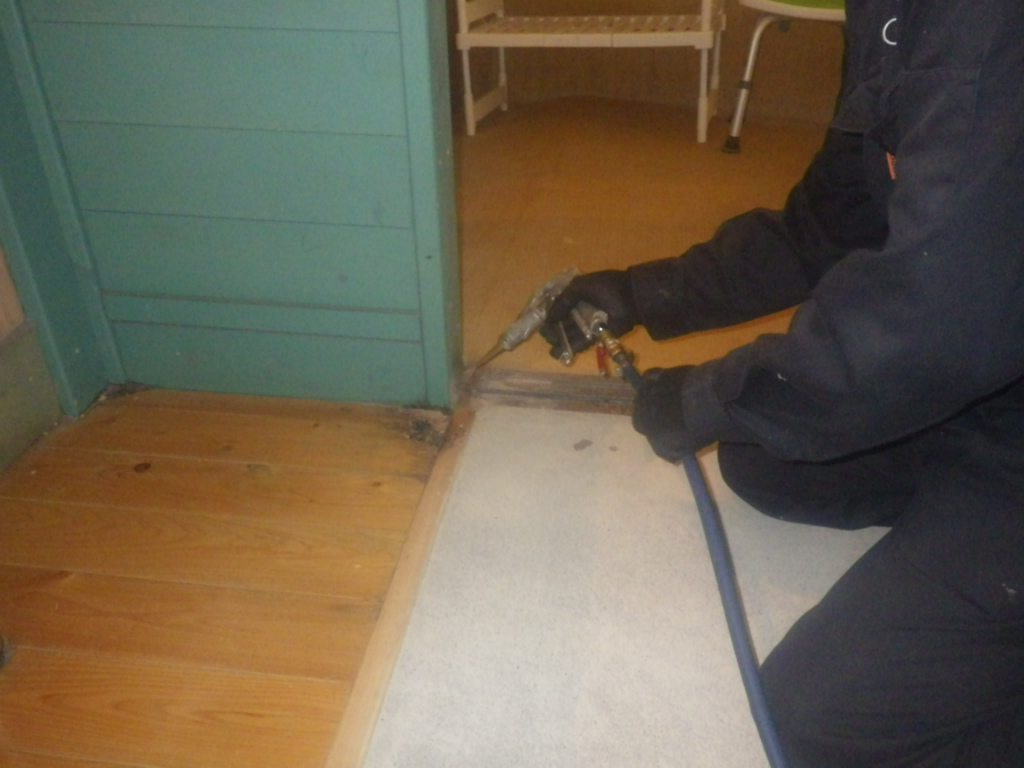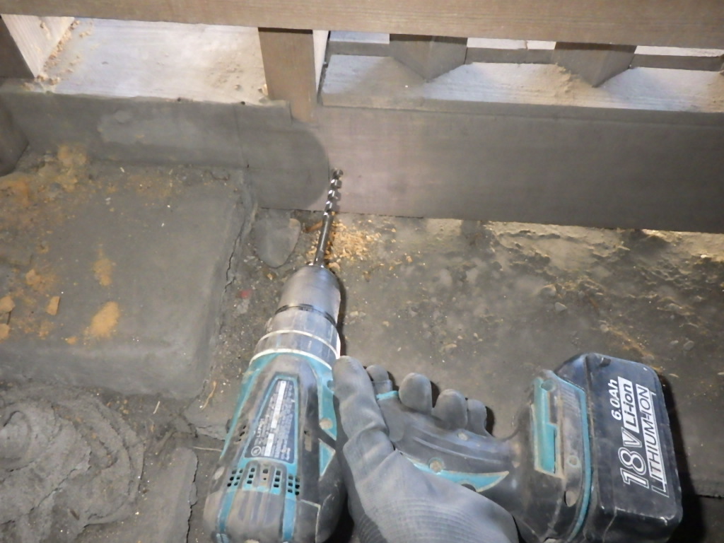 シロアリの施工は最初に木部にドリルで穴を開け(穿孔)ます。