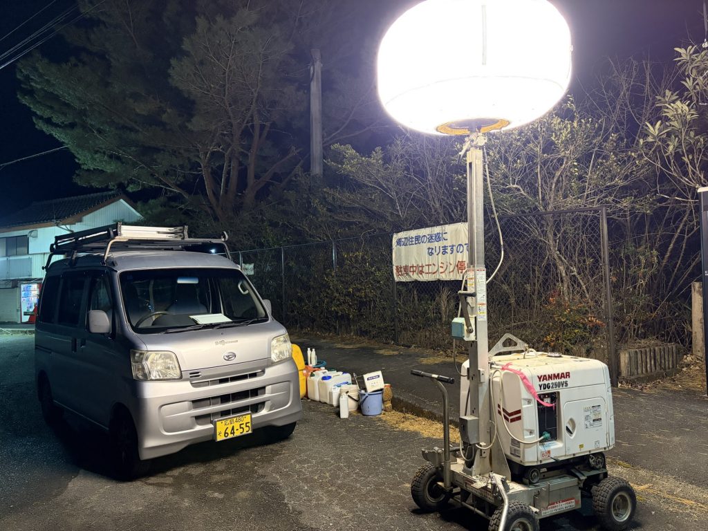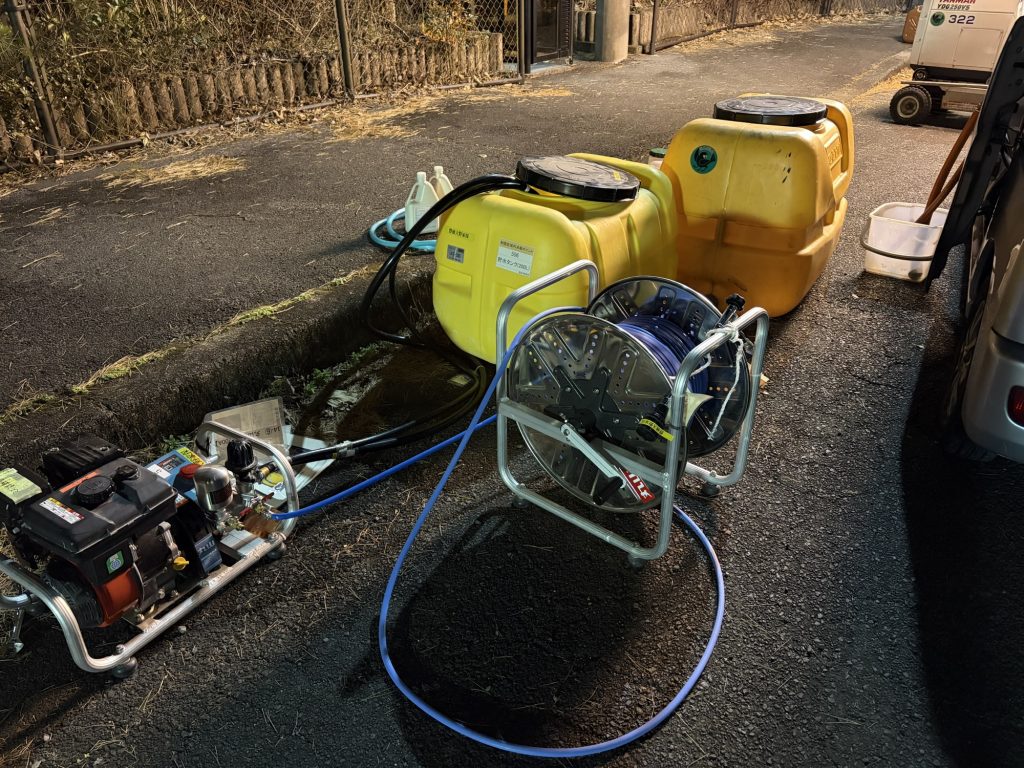 動噴機を使って出入りする車両に吹き付ける薬剤と機械一式です。水物ですので、この寒い夜間は凍ってしまう恐れが⁉︎なので24時間フル稼働していつでも対応出来る様にしています。