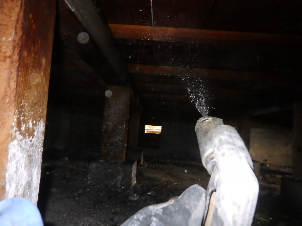 を行い私は薬剤を注入し木栓で蓋をし床下全体に薬剤を散布させていただきました!!